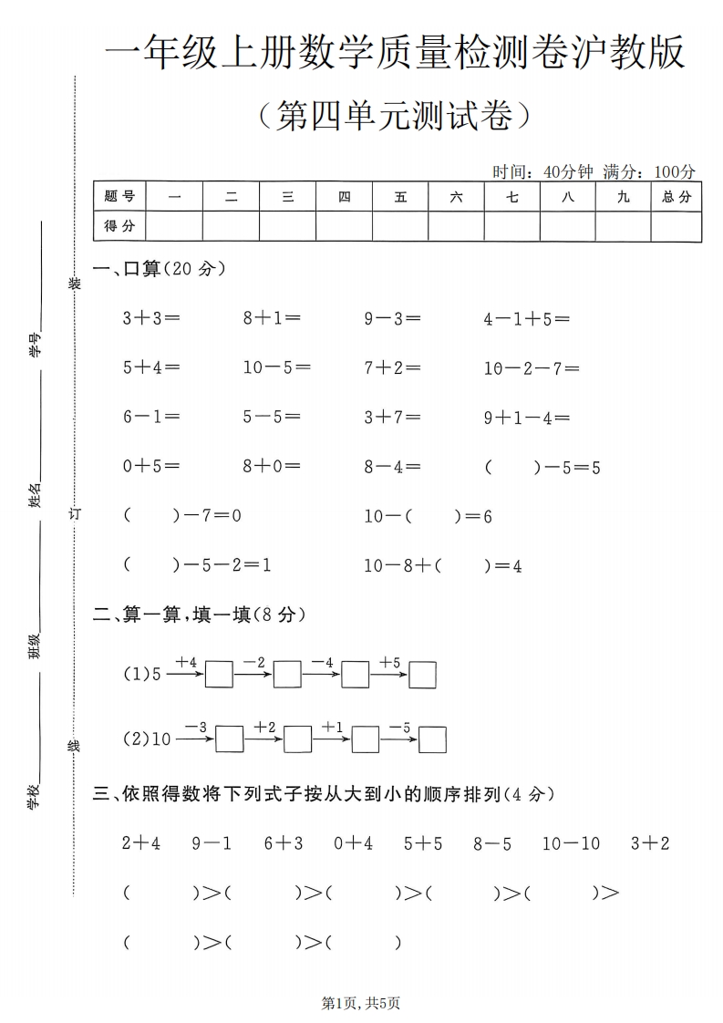 一年级(上)数学第四单元质量检测卷1《沪教版》