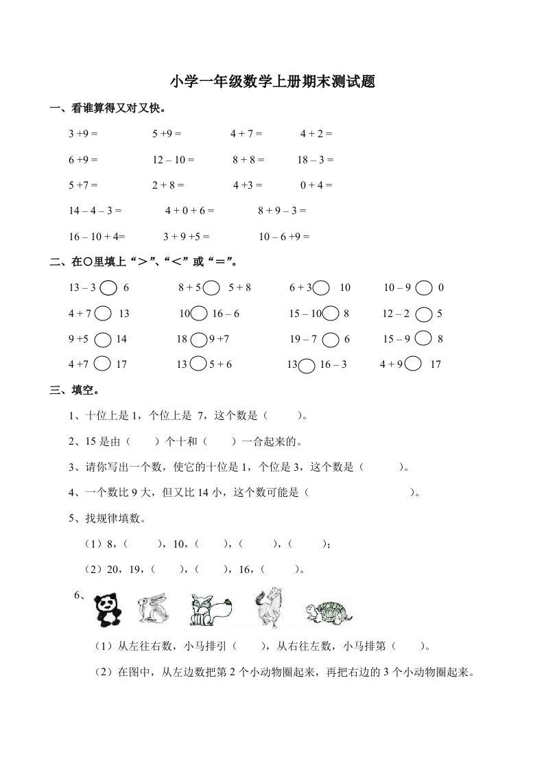 首页一年级数学上册一(上)西师版数学期末真题模拟卷