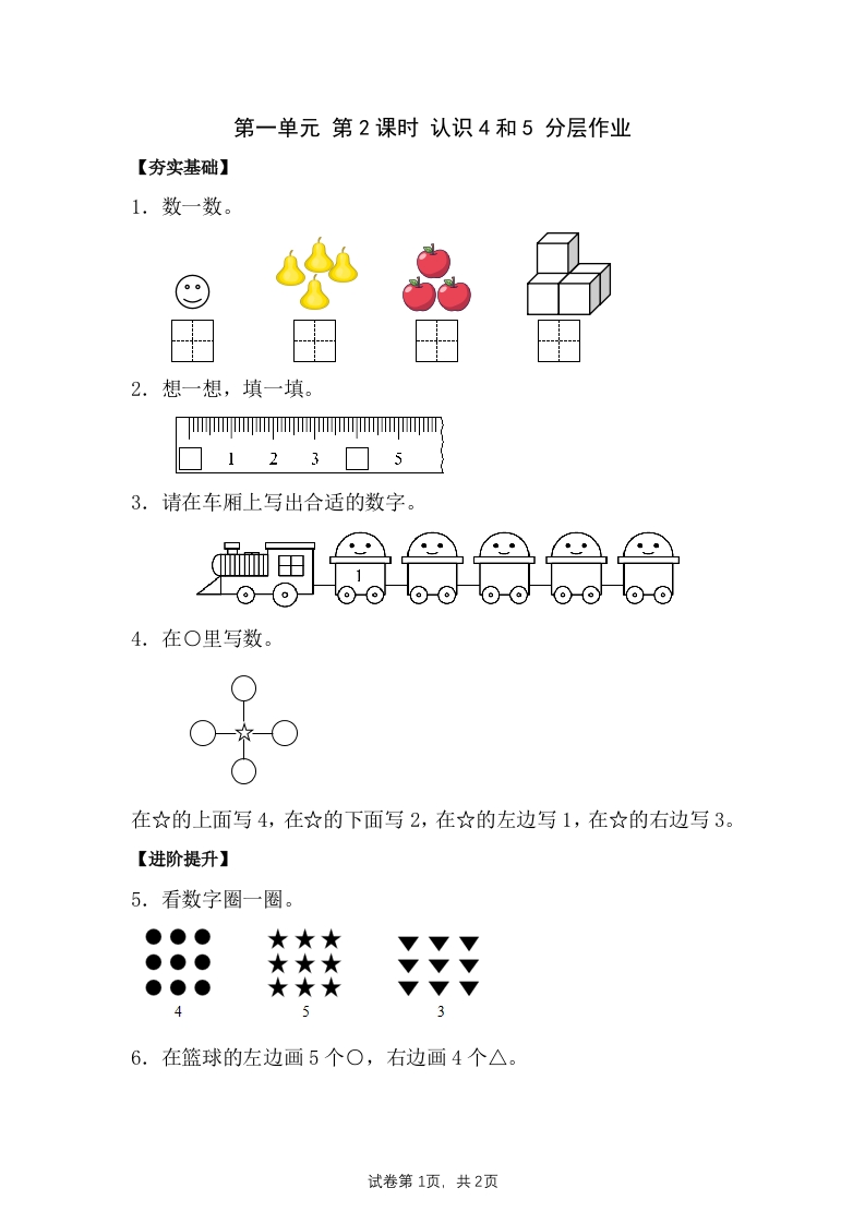 首页一年级数学上册第1单元 第2课时 认识4和5(分层作业)-一年级数学上册同步高效课堂系列(苏教版▪2024秋)