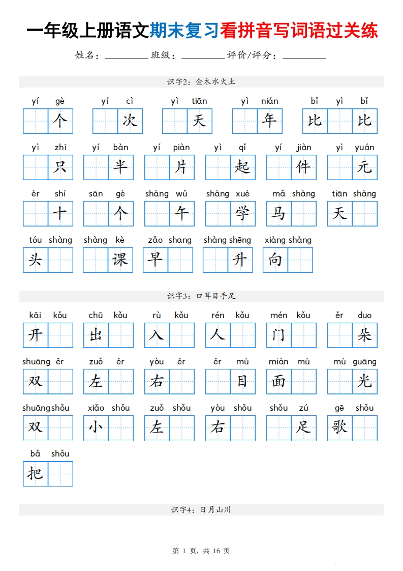 【25秋一上语文期末复习看拼音写词语过关练(含答案16页)