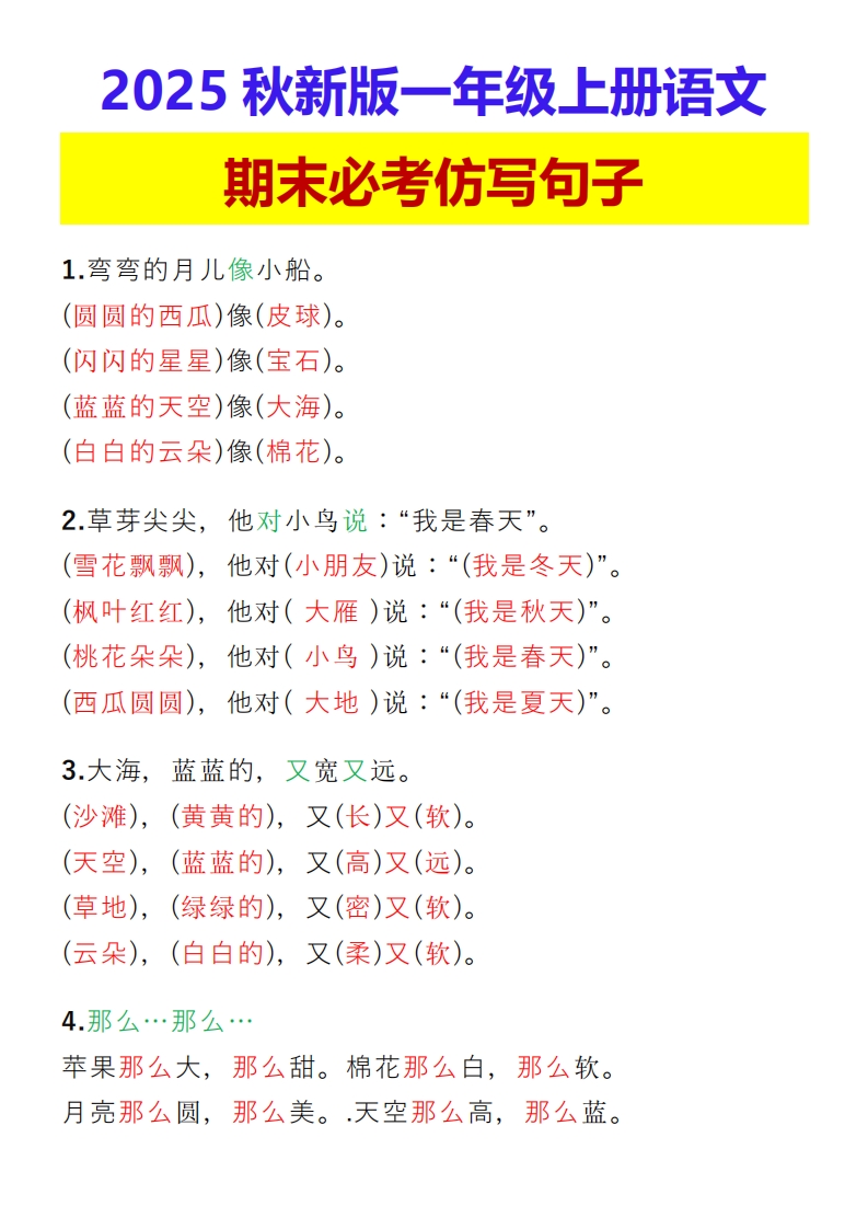首页一年级语文上册【2025秋新版】一年级上册语文 期末必考仿写句子
