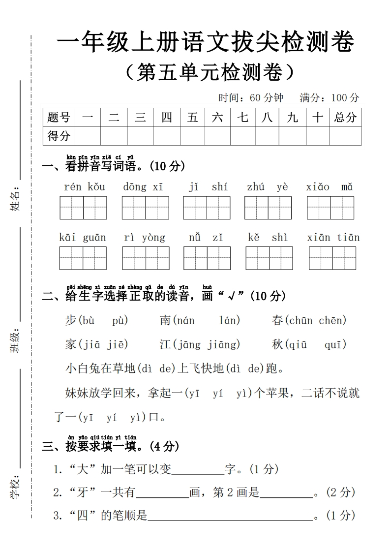 25年一年级上册语文第五单元拔尖检测卷----人口