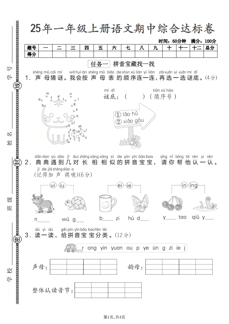 首页一年级语文上册25年一年级上册语文期中综合达标卷