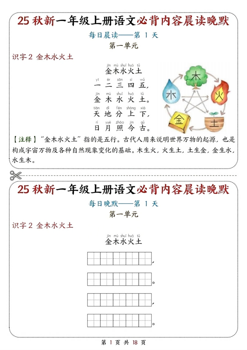 首页一年级语文上册25秋新一上语文必背内容晨读晚默18天(18页)