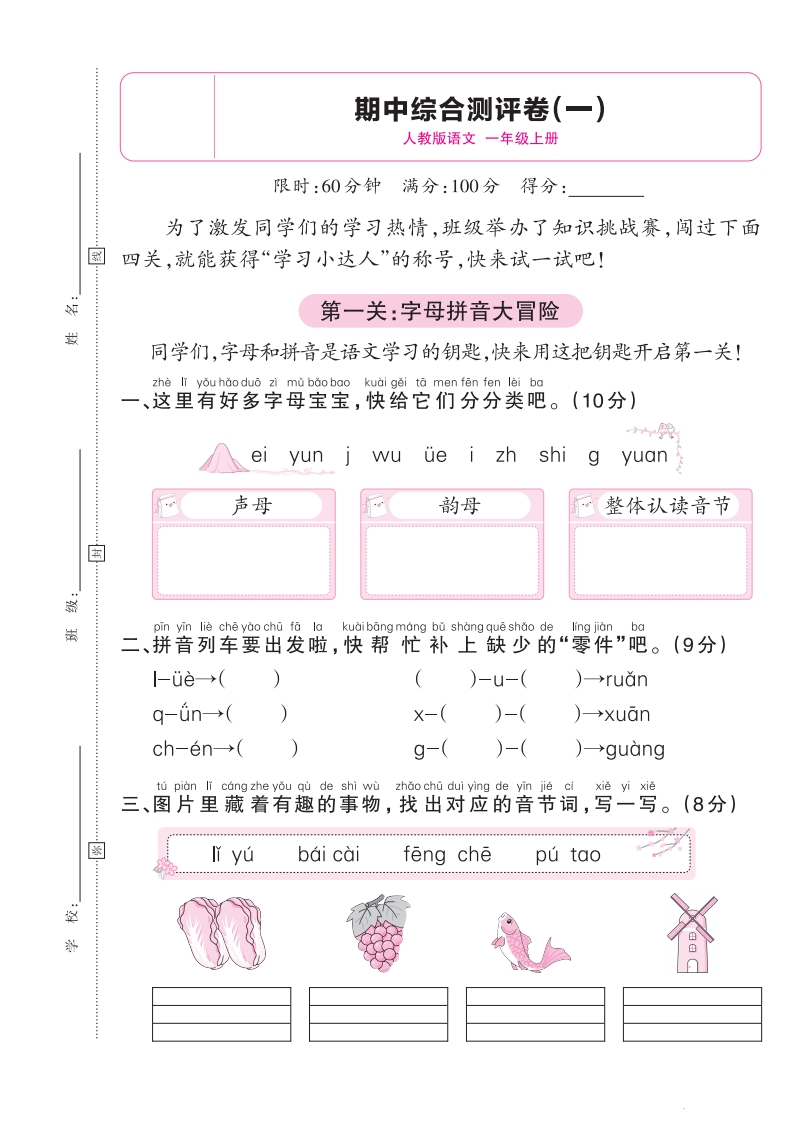 25秋一年级语文人教版期中综合测评卷(一)竖版