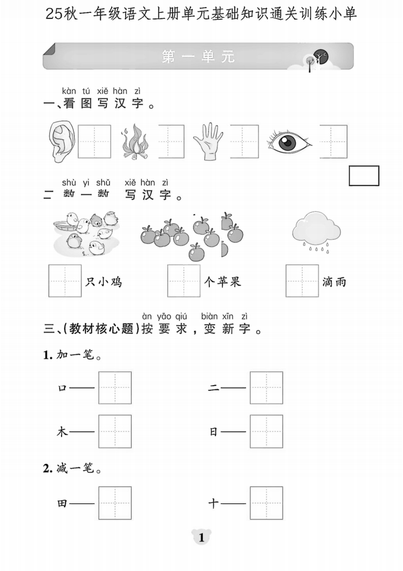 首页一年级语文上册25秋一年级语文上册单元基础知识通关训练小单含答案