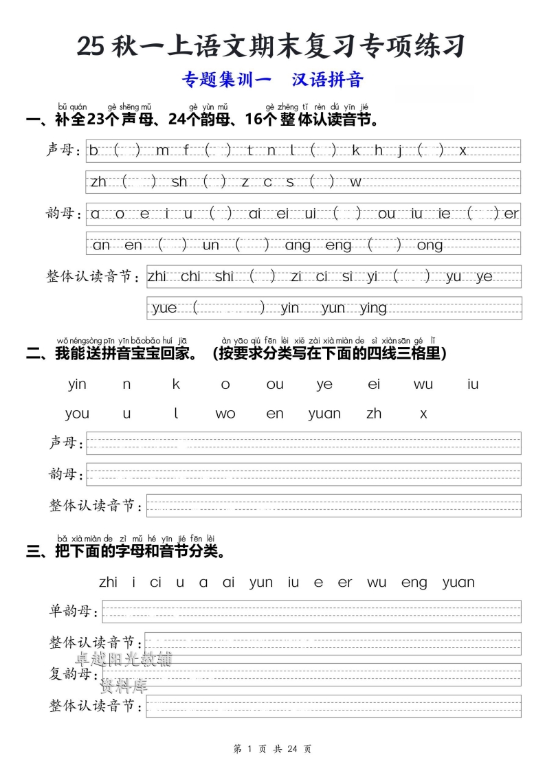 首页一年级语文上册25秋一上语文期末复习专项练习