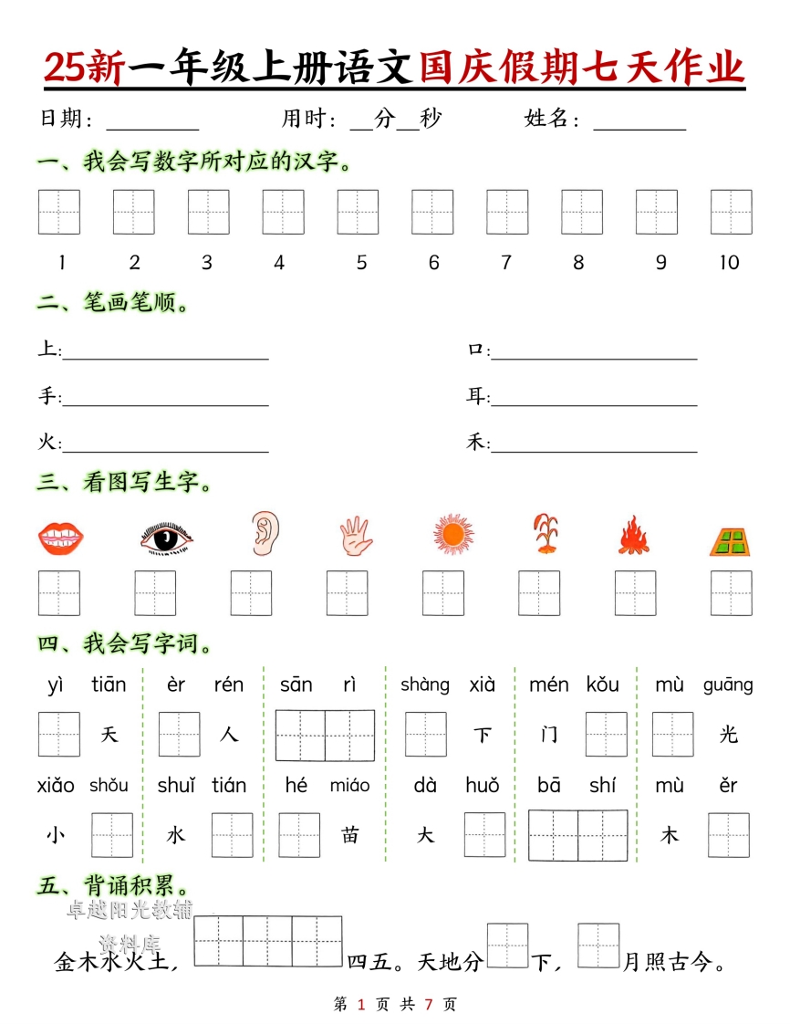 25新一年级上册语文国庆假期作业