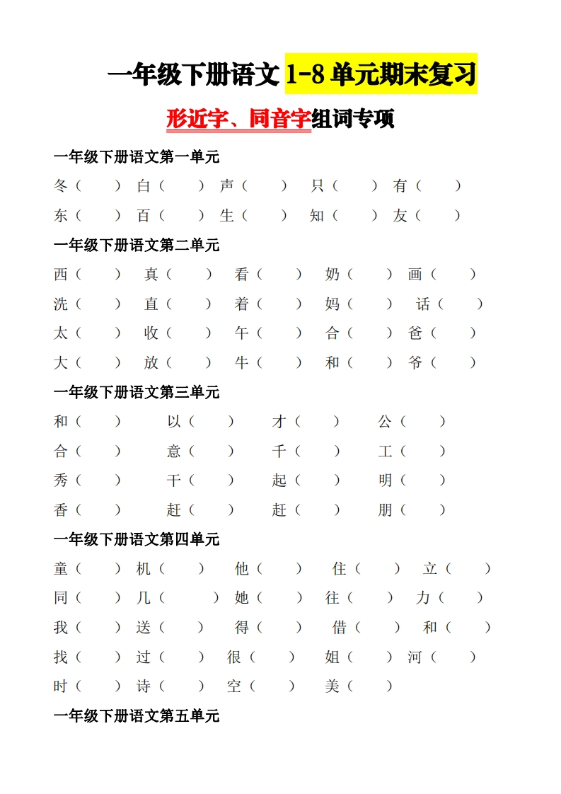 首页一年级语文下册【期末复习1】形近字+同音字组词专项 一下语文