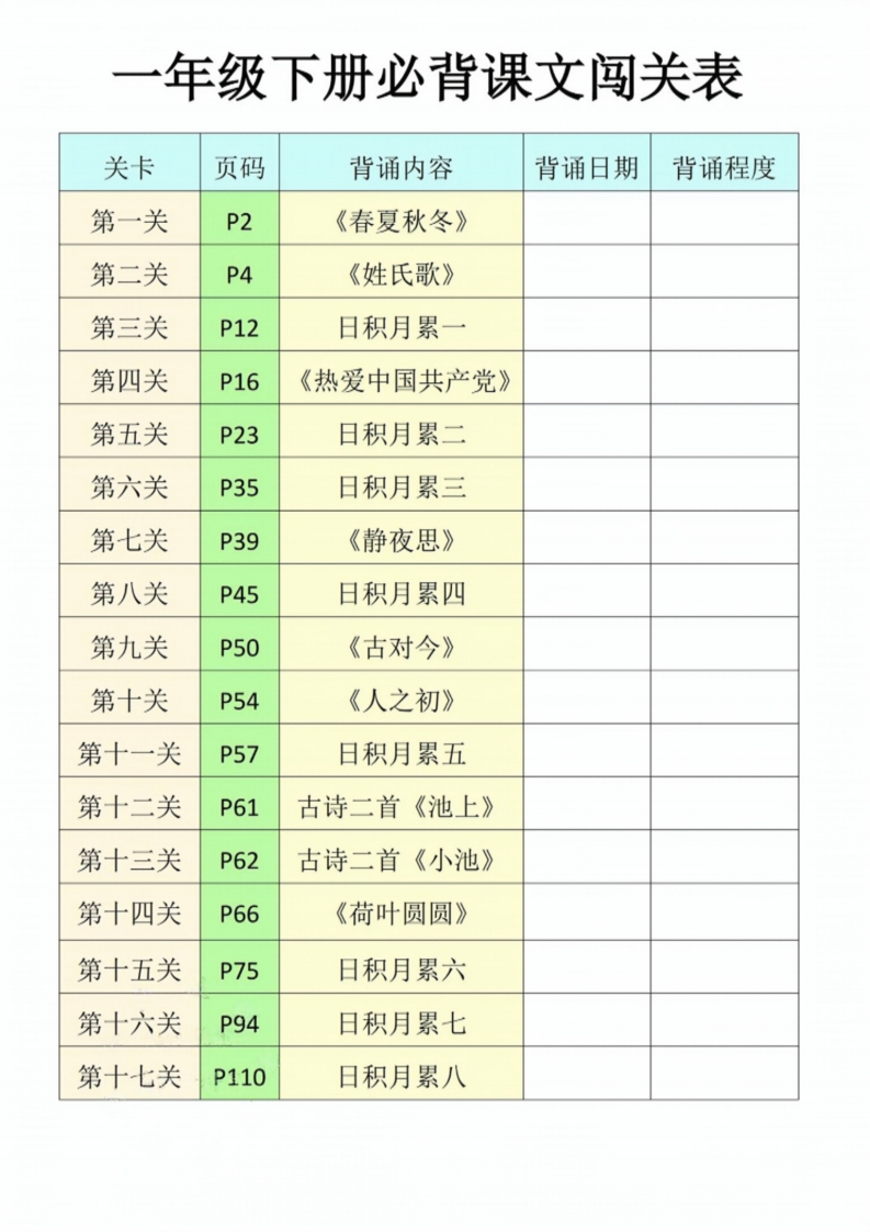 一年级(下)语文 必背课文闯关表