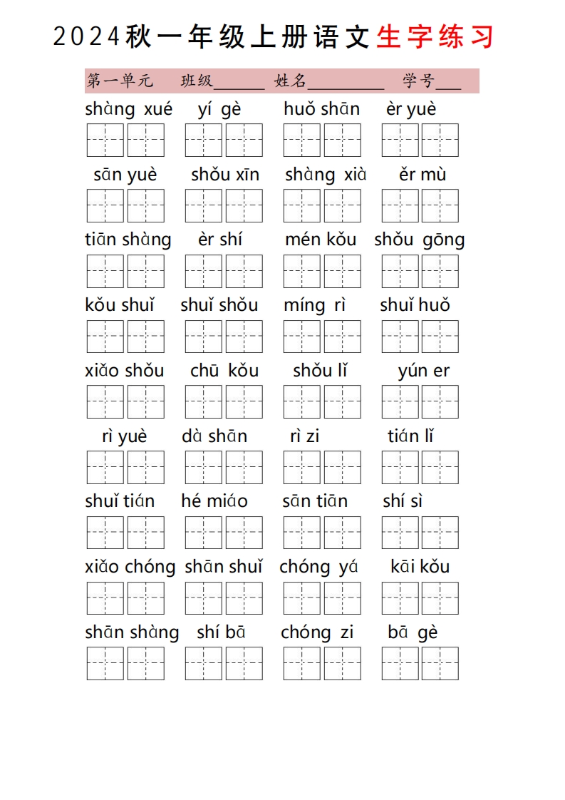 首页一年级语文上册一上语文1-6单元(全册)看拼音写词语