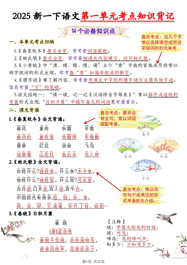 首页一年级语文下册新一下语文1-8单元考点知识背记(32页)