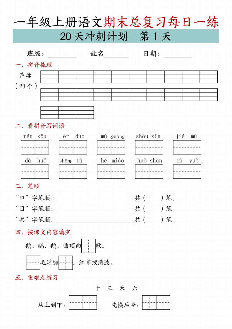 首页一年级语文上册一上语文期末总复习冲刺计划20天专项练习