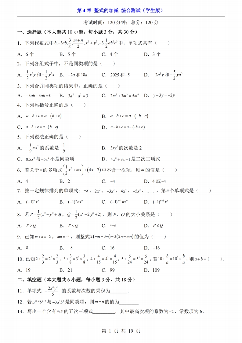 七年级(上)数学 第4章整式的加减 综合测试(人教版)