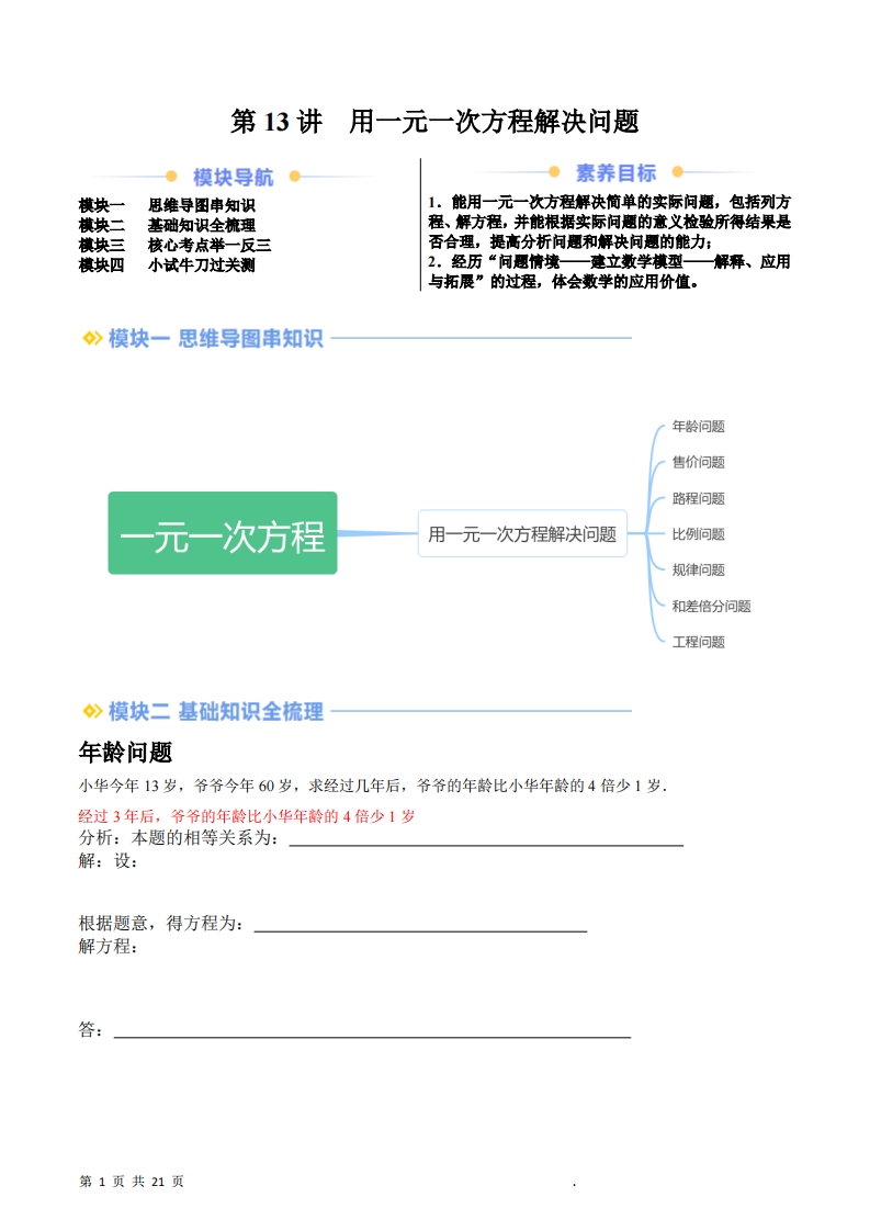七年级(上)数学 用一元一次方程解决问题暑假自学课