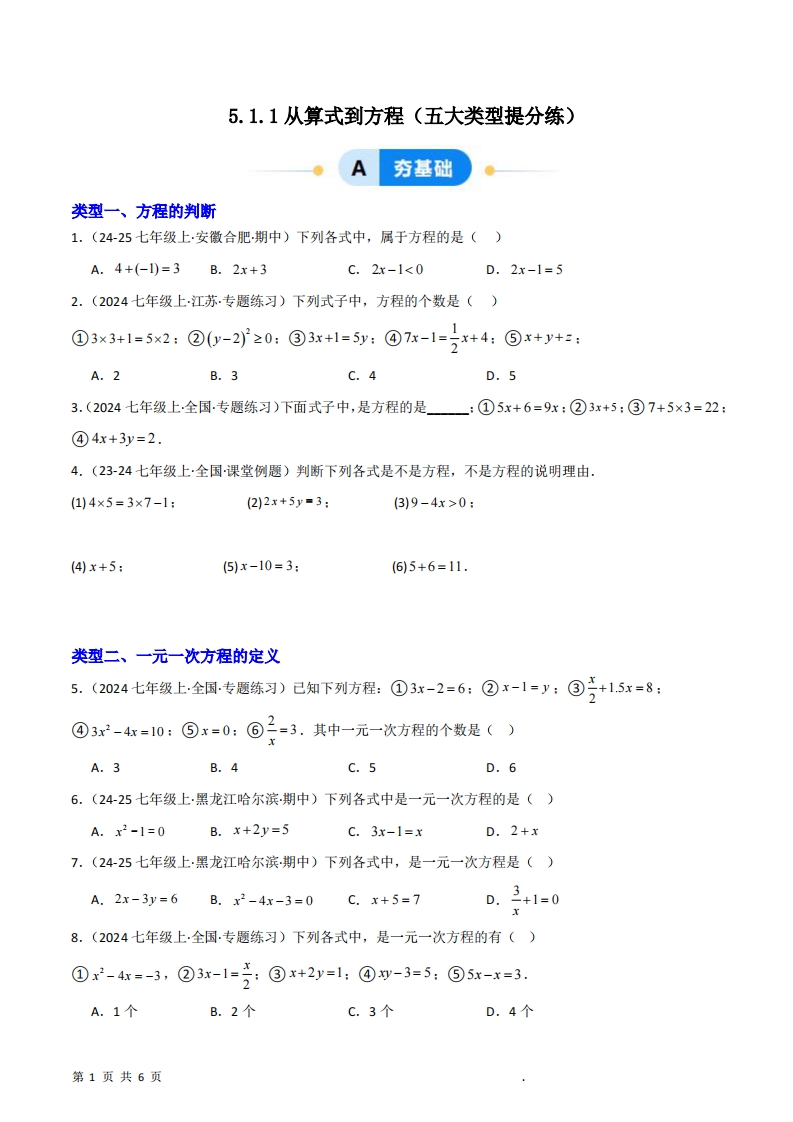 七年级(上)数学从算式到方程五大类型提分练