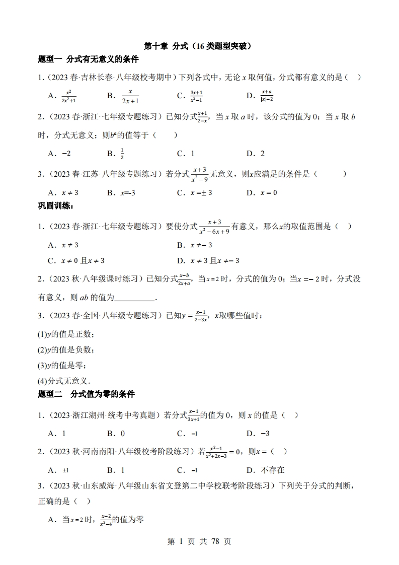 七年级(上)数学第十章 分式题型突破