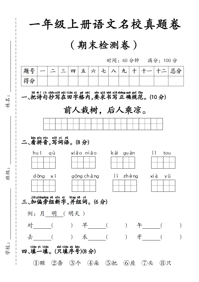 一年级上册语文期末拔尖检测卷3-1