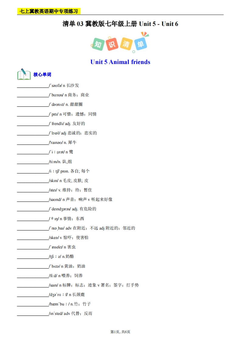 七年级(上)英语 U5-U6重点清单03(冀教版)
