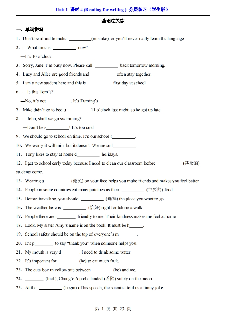 七年级(上)英语 Unit 1 课时4(分层练习)
