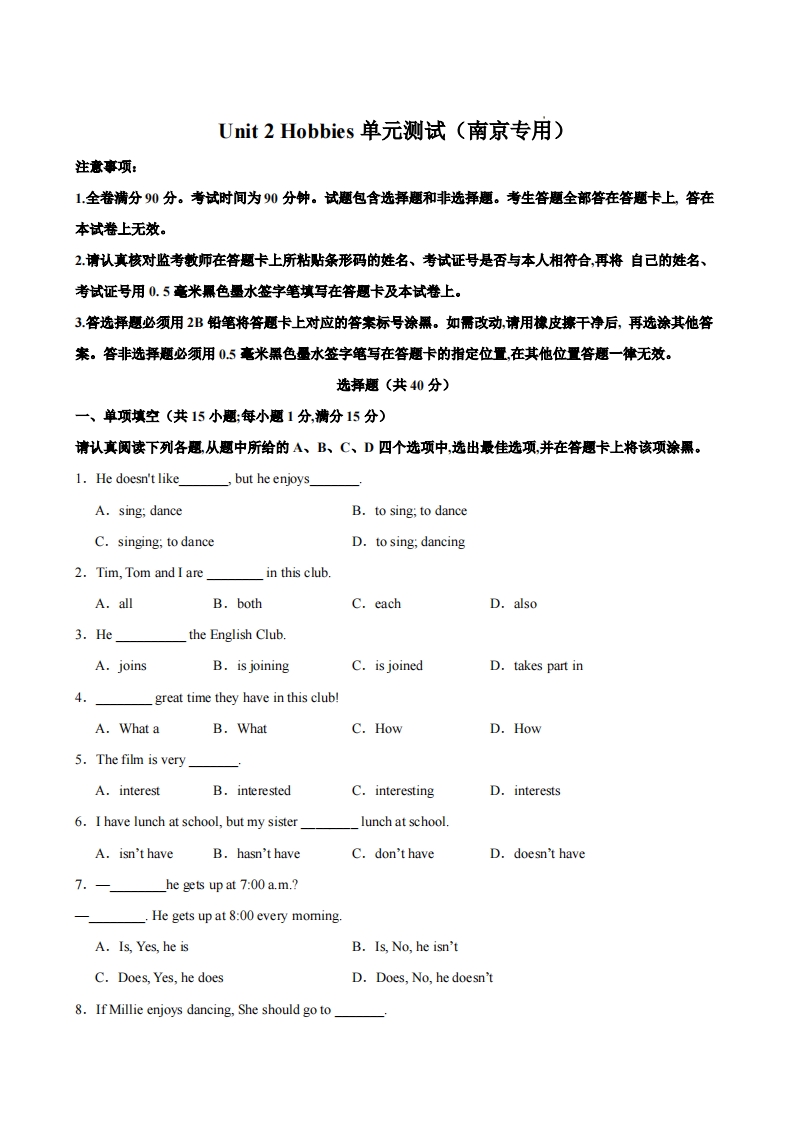 七年级(上)英语 Unit 2 单元测试(南京专用)(1)