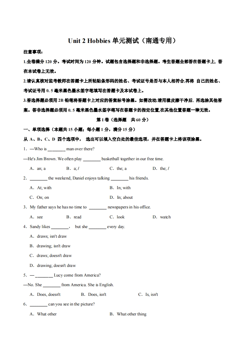 七年级(上)英语 Unit 2 单元测试(南通专用)(1)