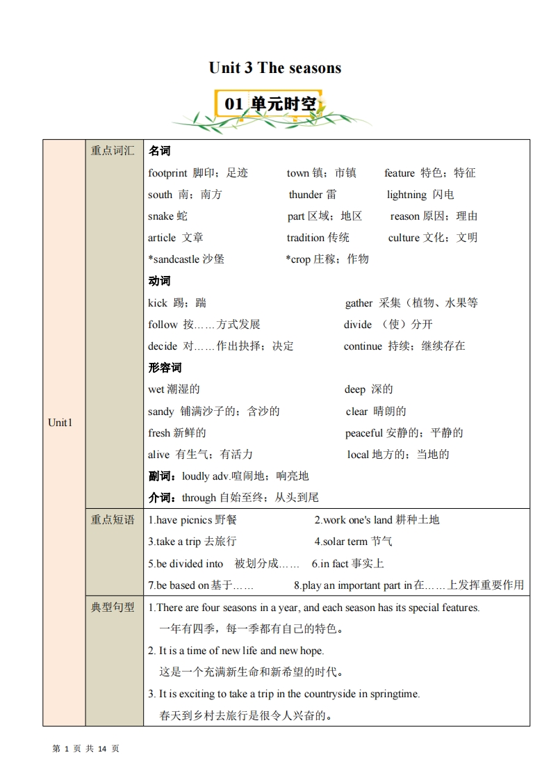 七年级(上)英语 Unit 3 速记清单(沪教牛津版)