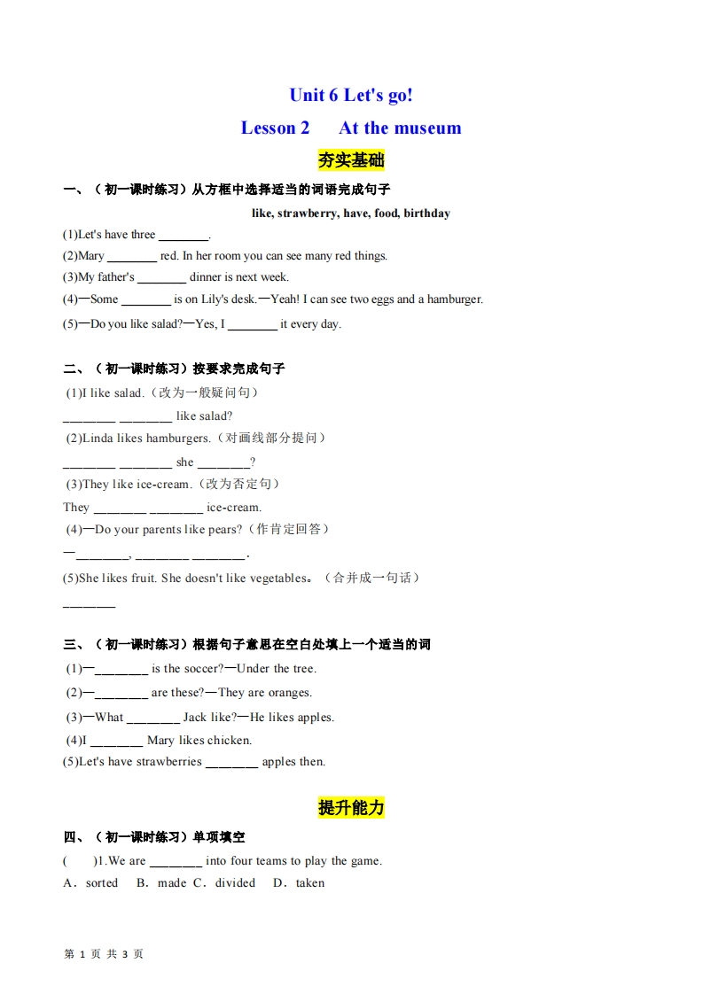 七年级(上)英语 Unit 6 分层练习2(冀教版)