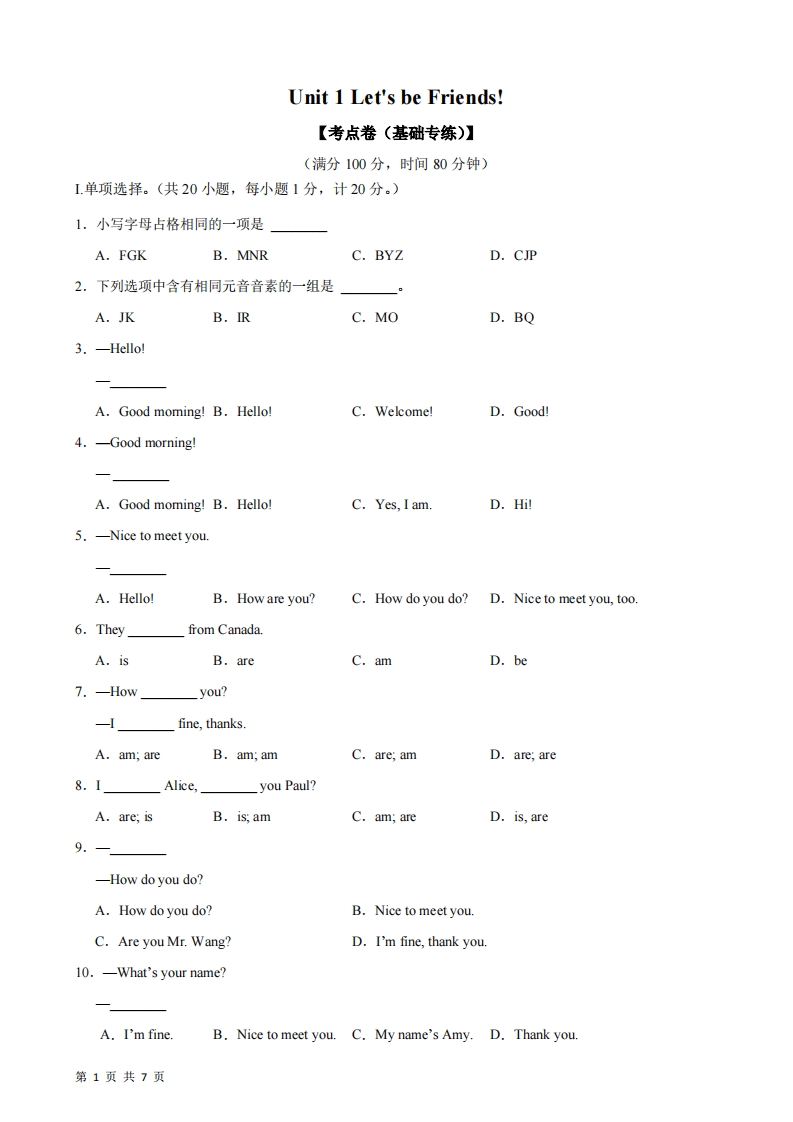 七年级(上)英语 Unit1考点卷(仁爱版)
