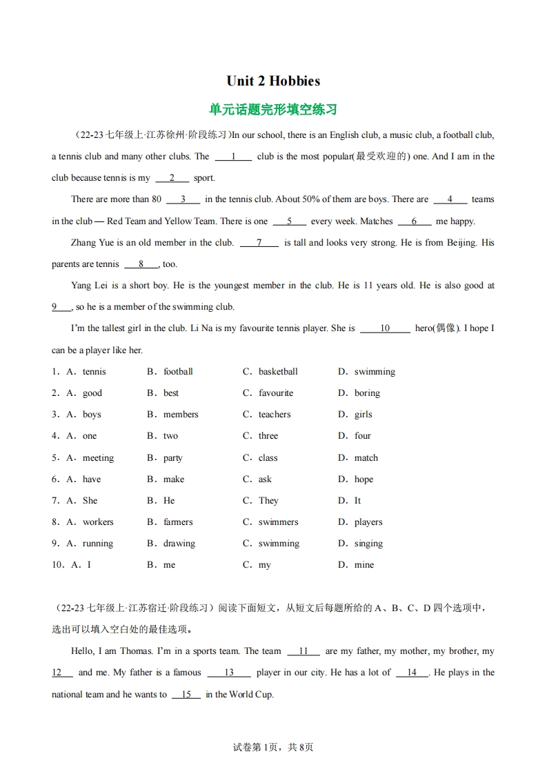 七年级(上)英语 Unit2单元话题完形填空练习(牛津译林版)