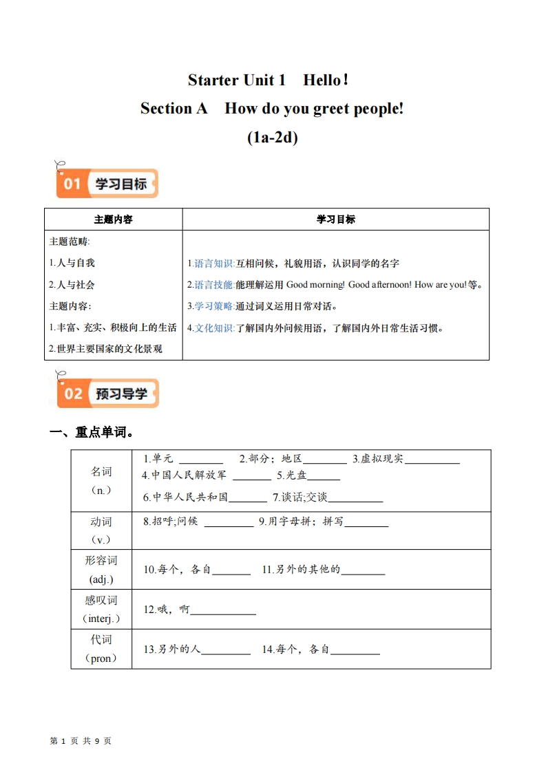七年级(上)英语Starter Unit1单元练习1(人教版)