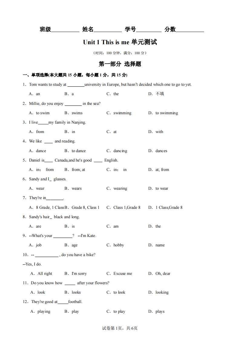 七年级(上)英语Unit 1单元测试(牛津译林版)