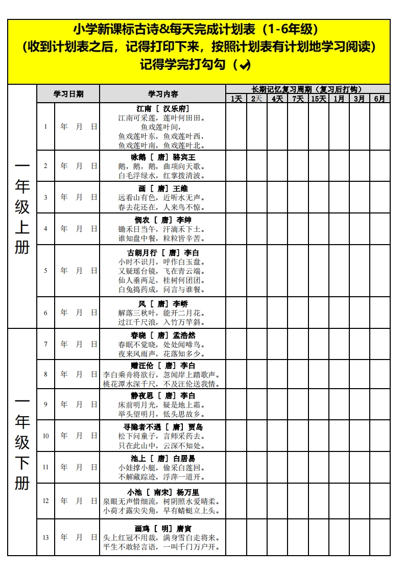 小学新课标古诗&每天完成计划表