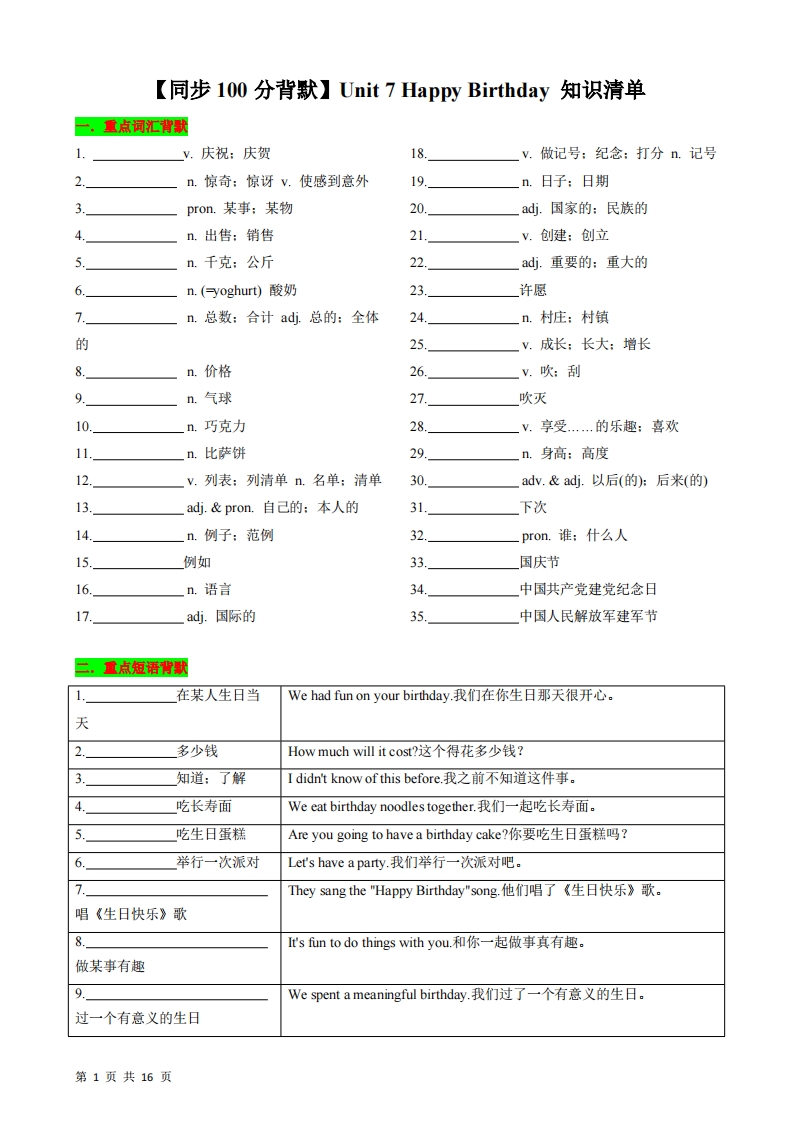 七年级(上)英语Unit7知识清单默写版(人教版)