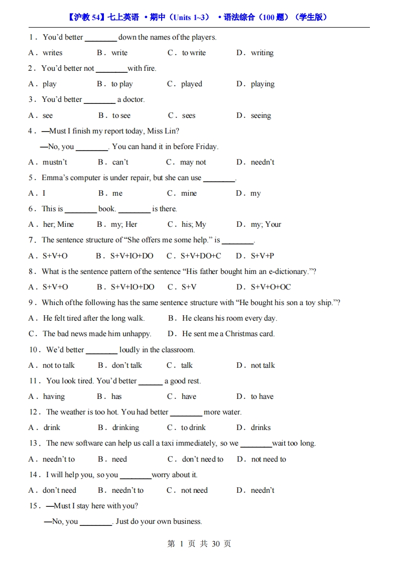 首页七年级英语上册七年级(上)英语期中语法综合100题(沪教54)