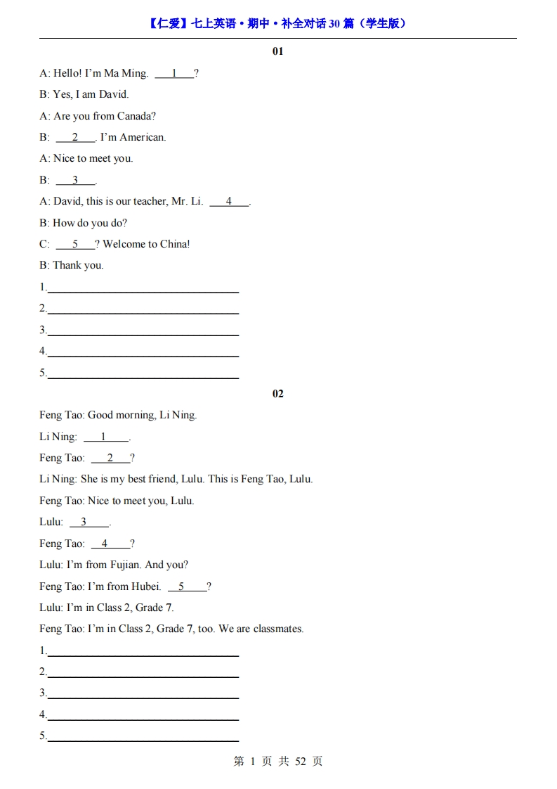 七年级(上)英语期中专项 补全对话30篇(仁爱版)