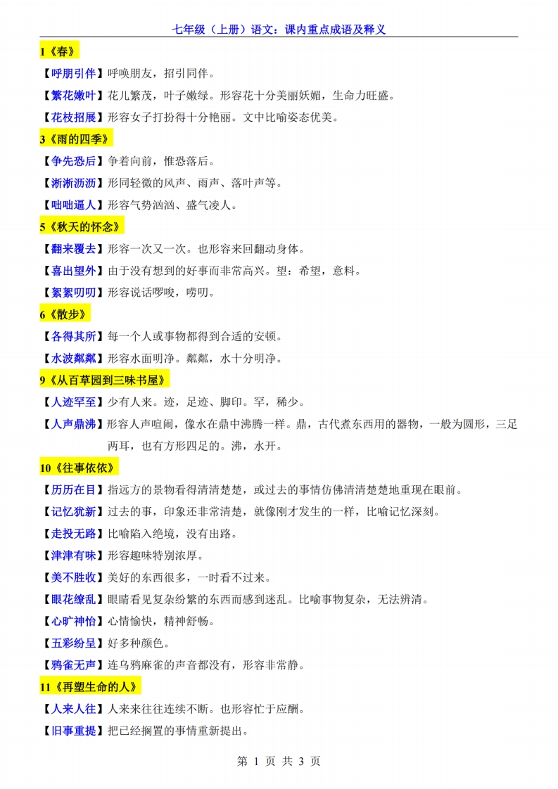 七年级(上)语文 课内重点成语及释义