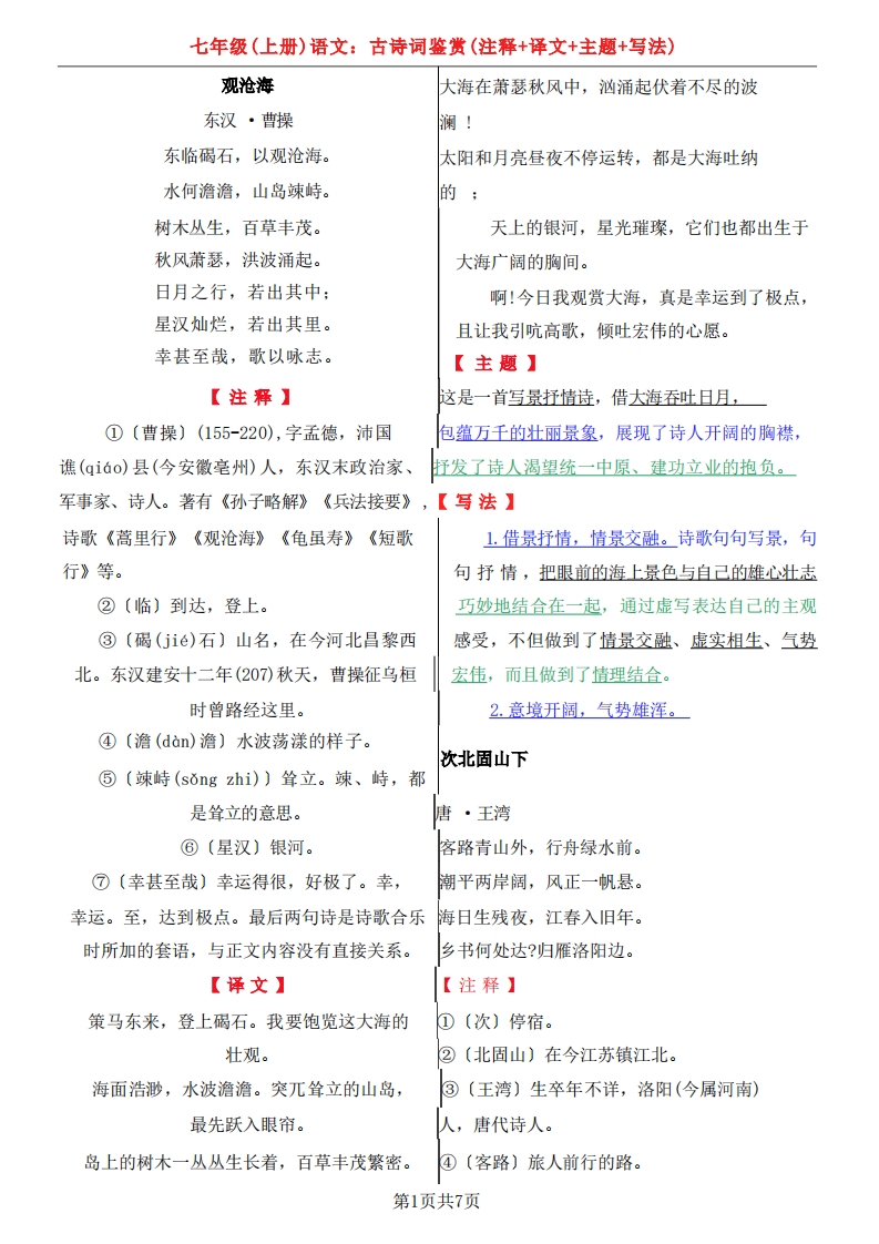 七年级(上)语文 全册古诗词鉴赏(注释+译文+主题+写法)