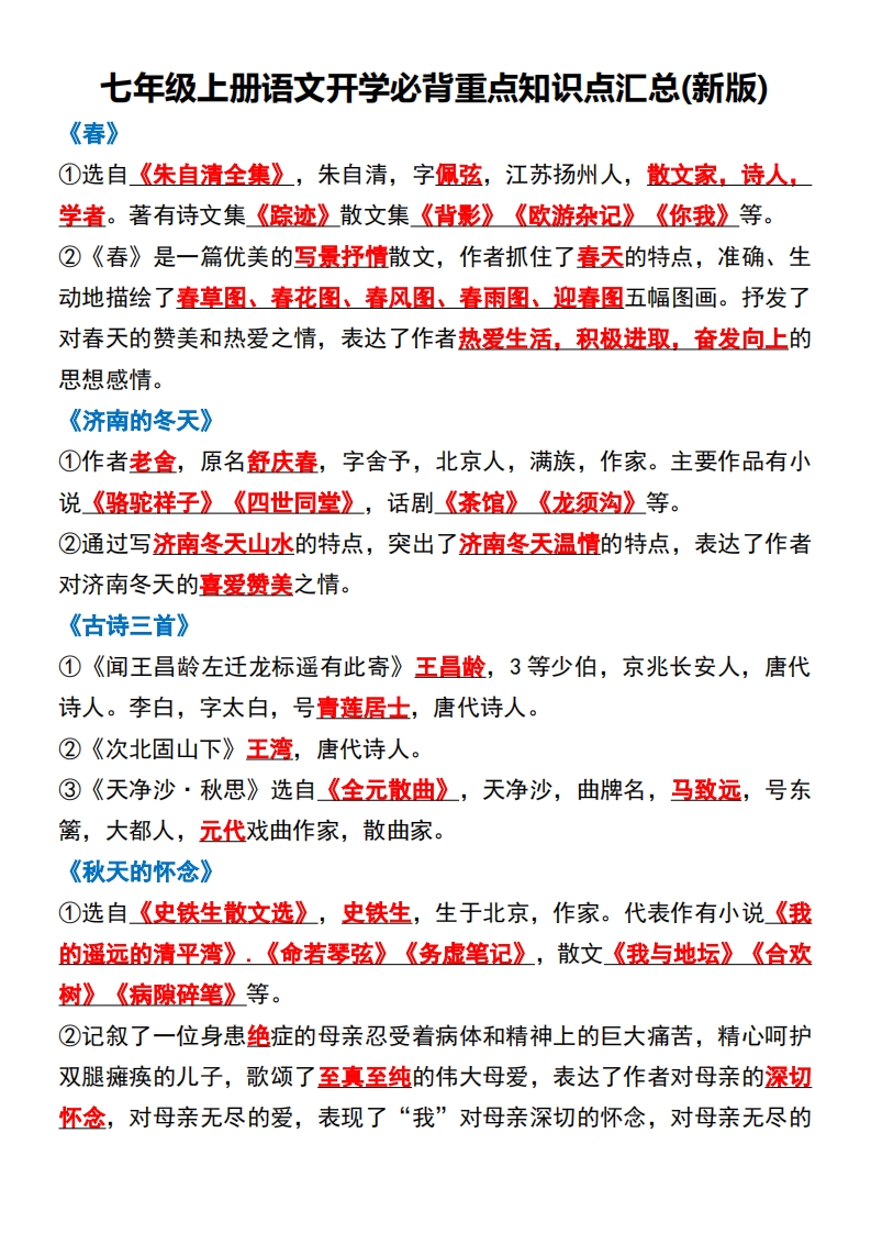 七年级(上)语文开学必背重点知识点汇总新版