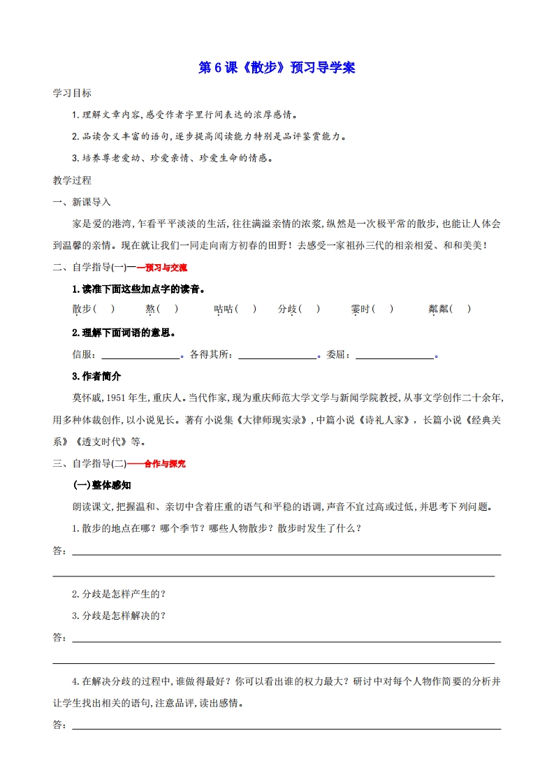 首页七年级语文上册七年级(上)语文预习导学案《散步》