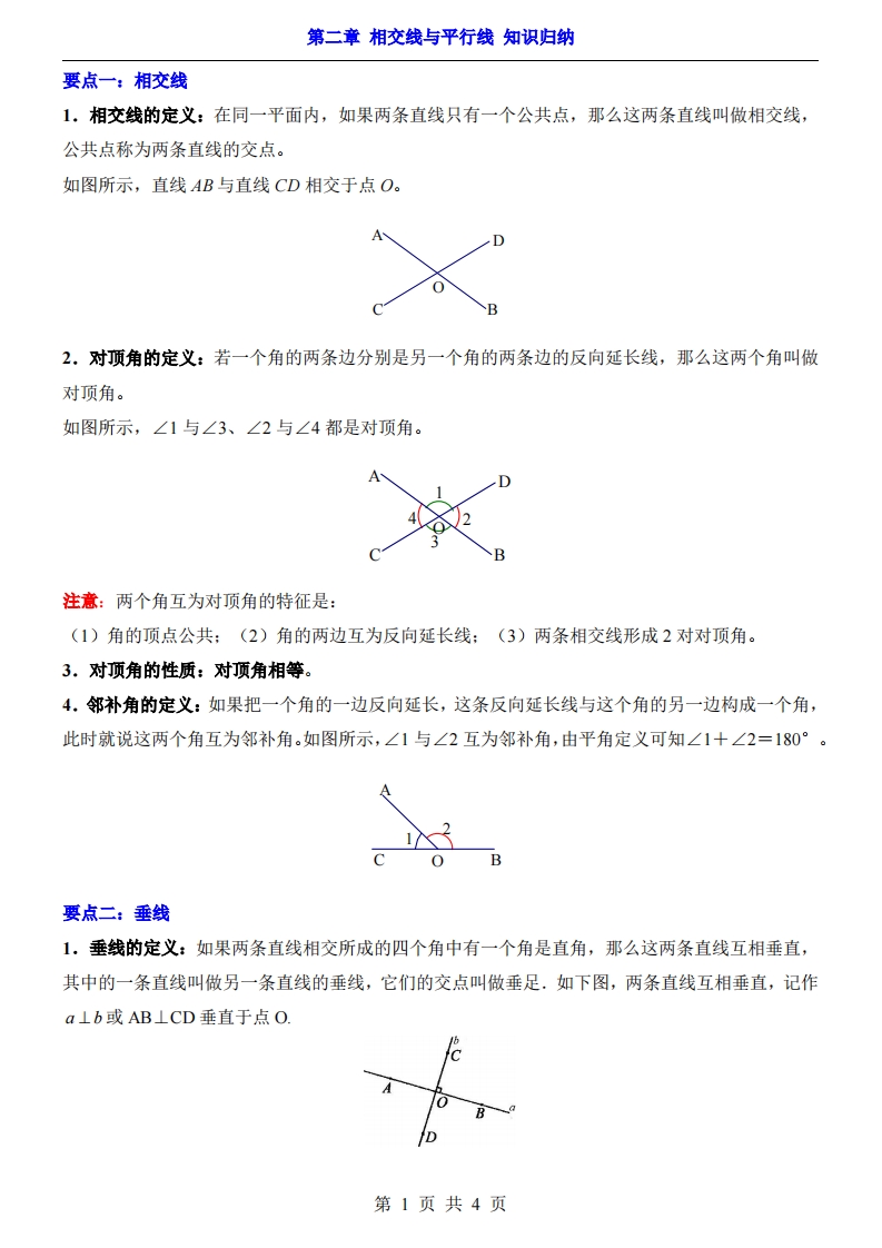 七年级(下)数学第2章相交线与平行线 知识归纳(北师大版)