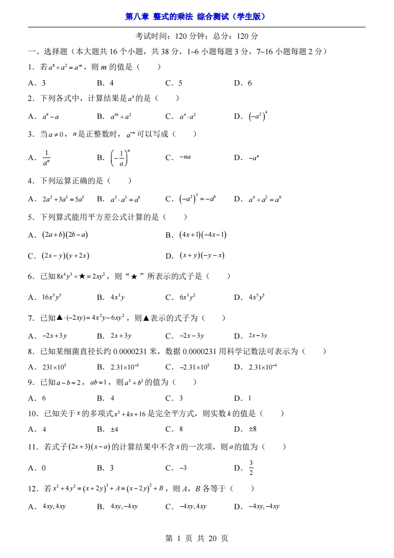 首页七年级数学下册七年级(下)数学第8章整式的乘法 综合测试(冀教版)
