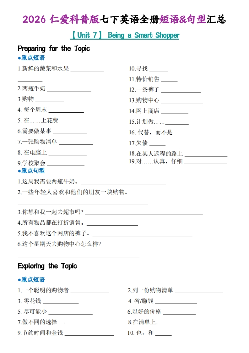 2026仁爱科普版七下英语全册短语&句型汇总(默写版)