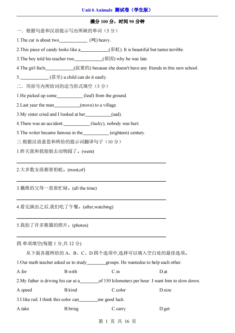 首页七年级英语下册【北师】七下英语Unit 6(测试卷)