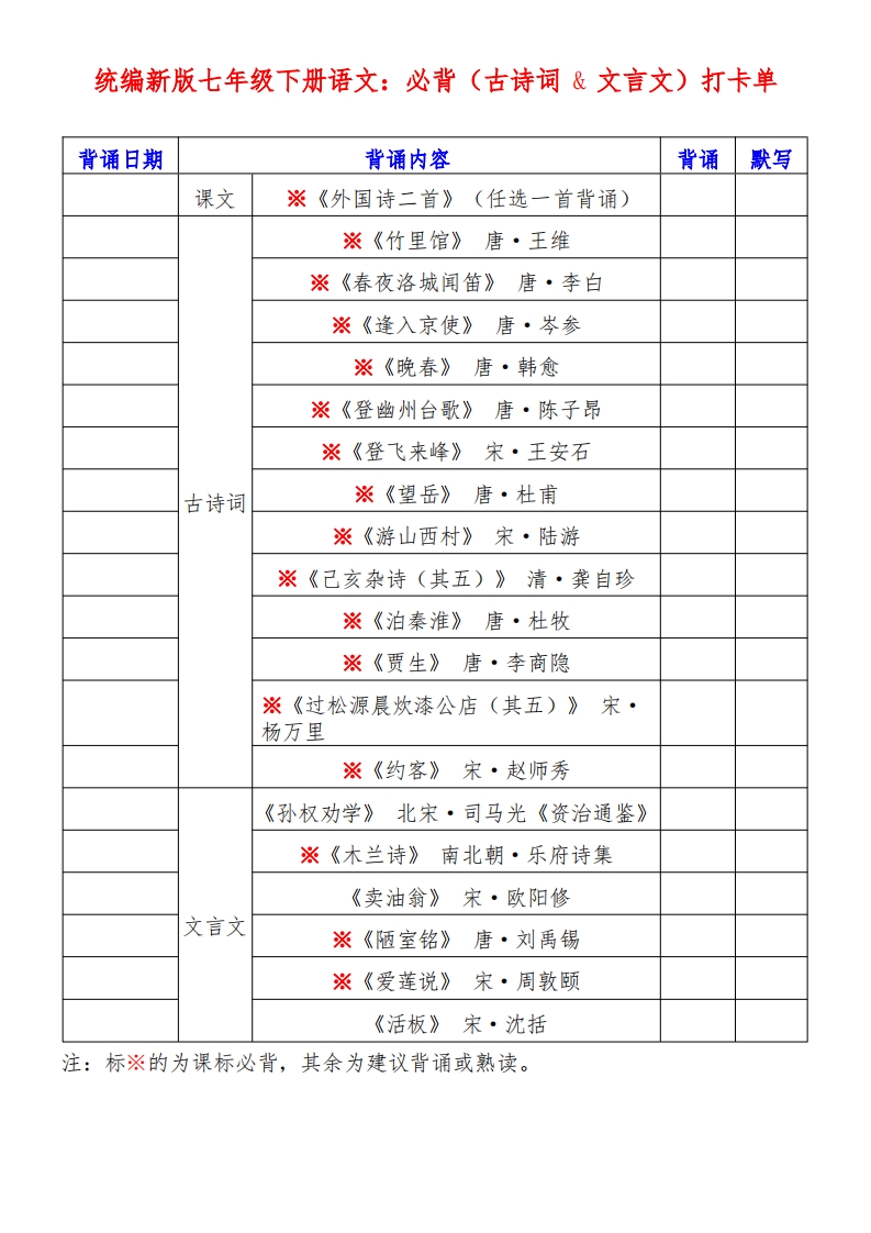 首页七年级语文下册新七下语文必背【古诗词&文言文】打卡单