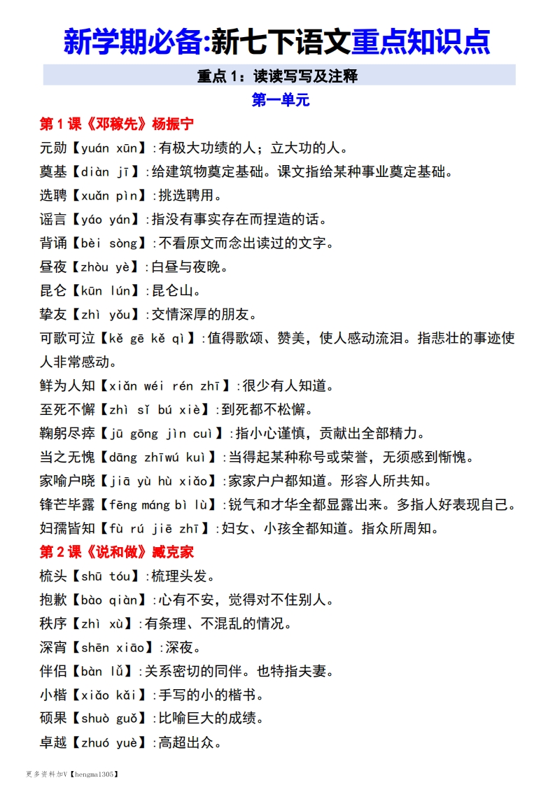 首页七年级语文下册新学期必备;新七下语文重点知识点