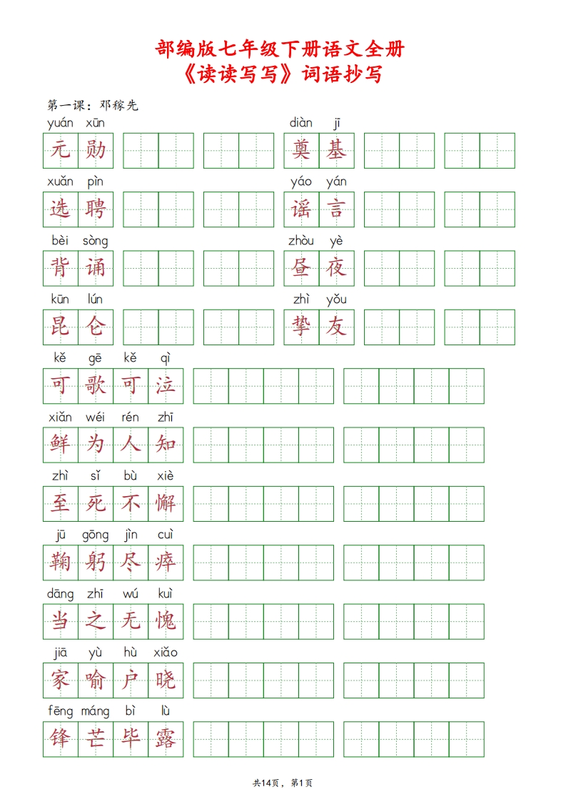 部编版七年级下册语文全册《读读写写》词语抄写