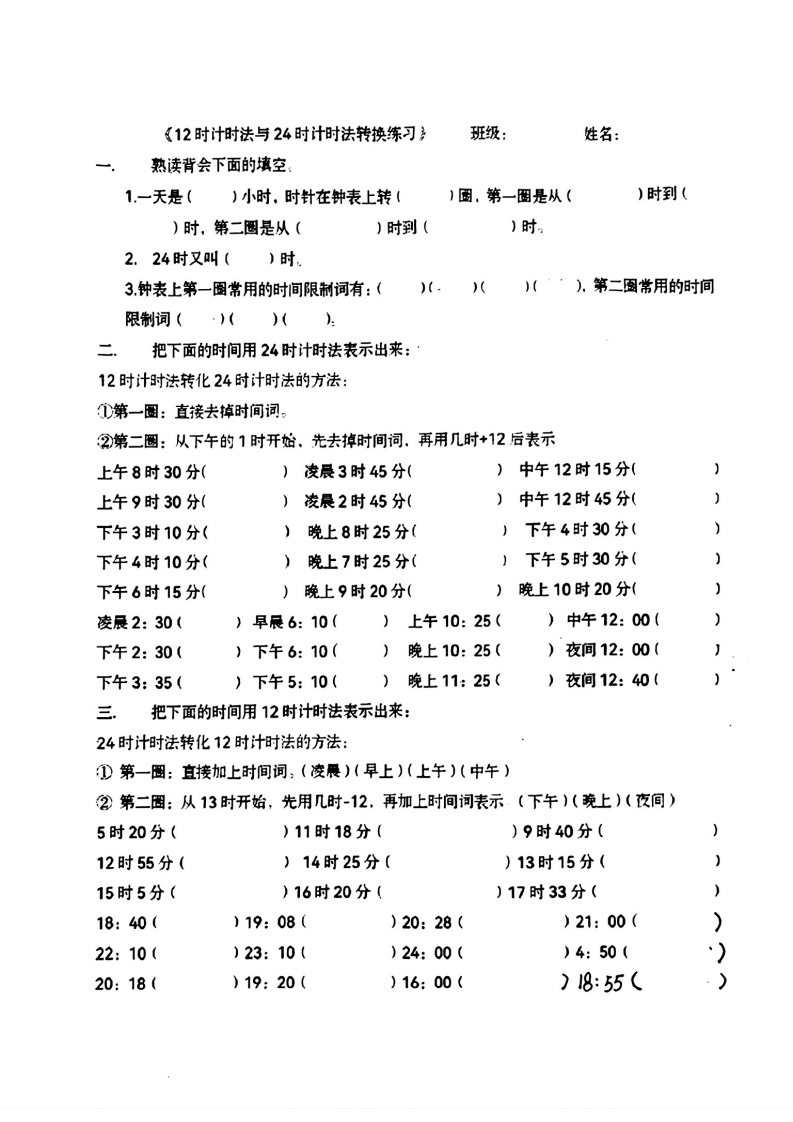首页三年级数学上册12时计时法与24时计时法转换练习