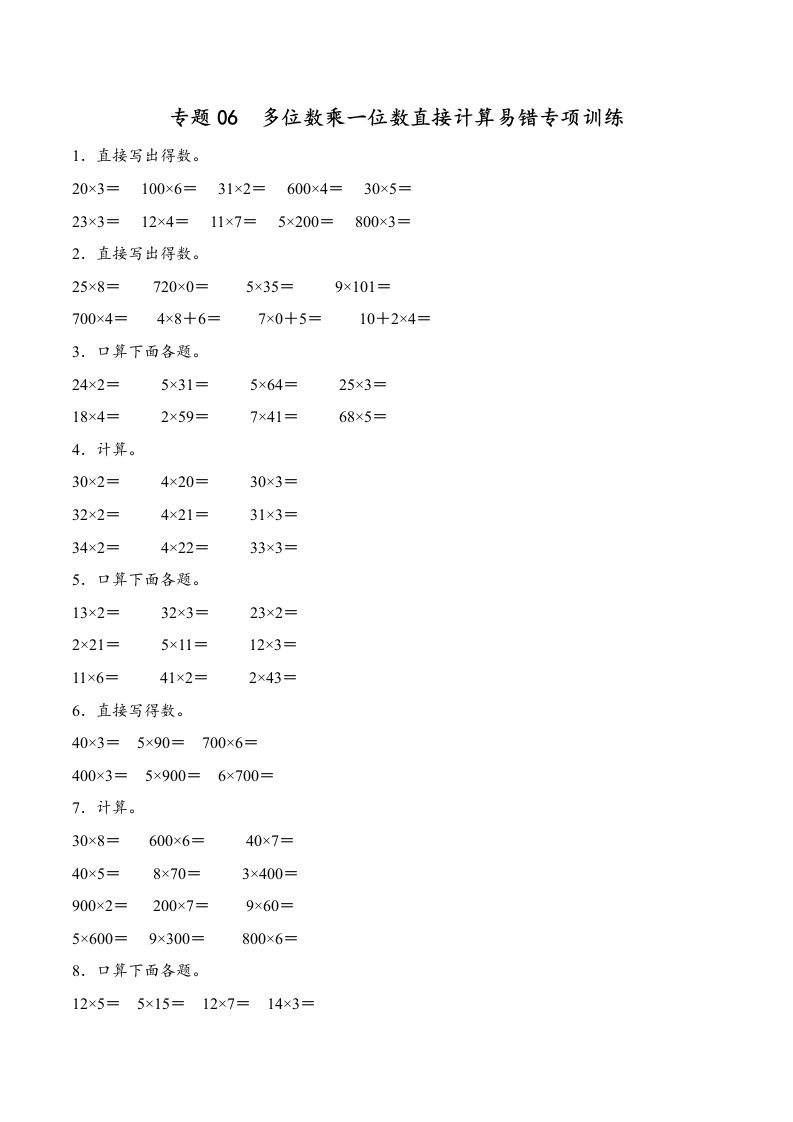 专题06 多位数乘一位数直接计算(易错专项训练)数学人教版三年级上册(原卷版)