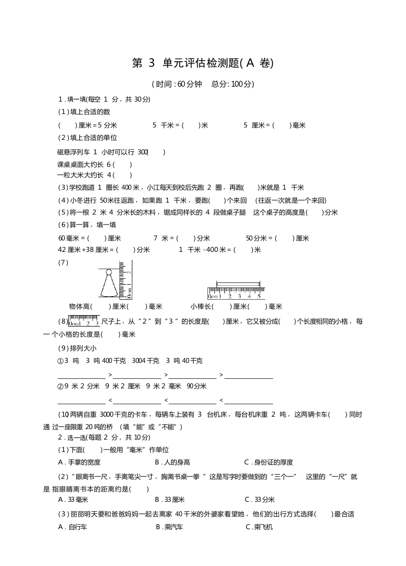 第3单元毫米、分米和千米评估检测题(A卷)(单元测试)(无答案)2025-2026学年三年级上册数学人教版